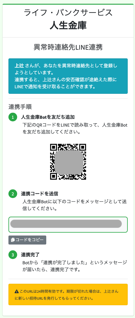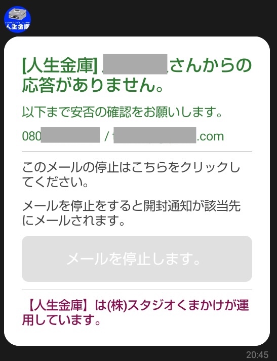 安否確認が止まった場合、メッセージが送信されてきます。